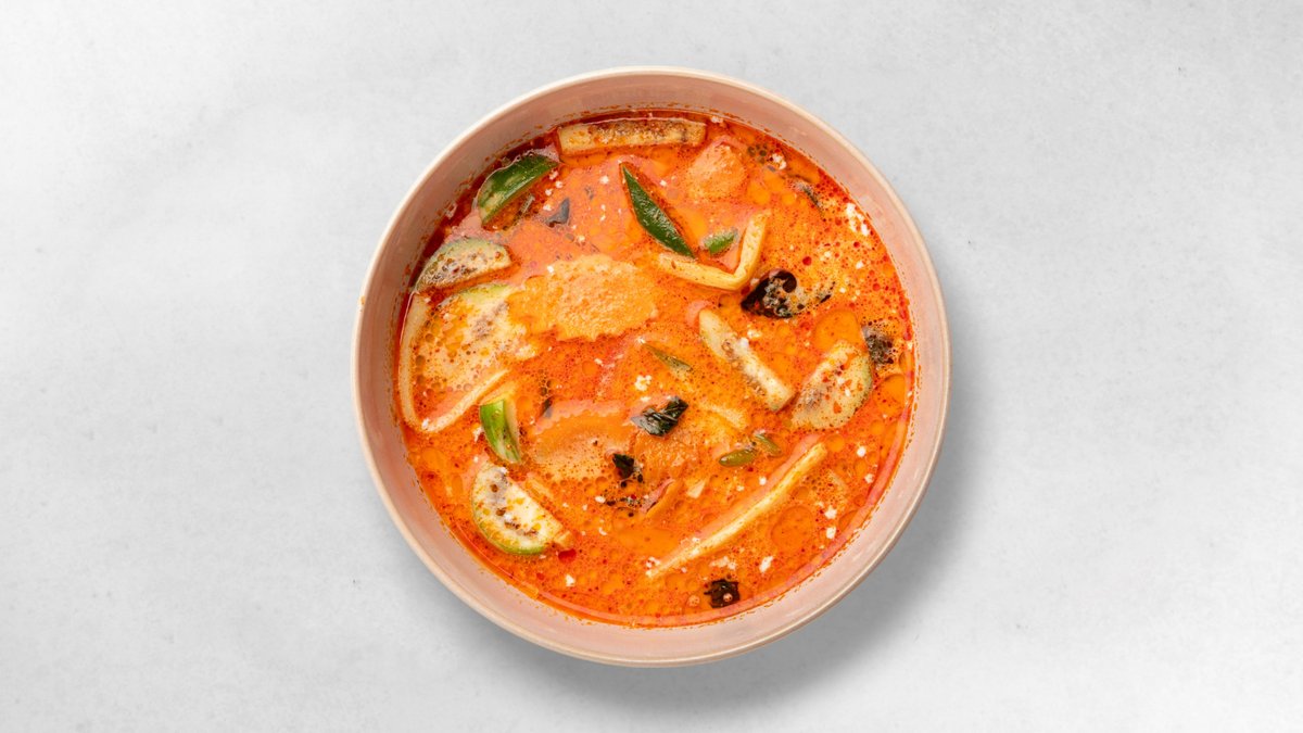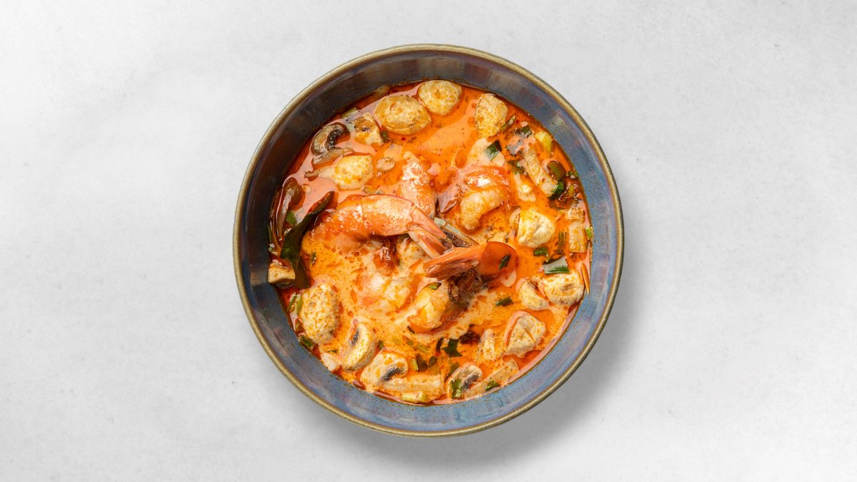 Spicy and sour Thai soup, coconut milk, lemongrass, galangal, tomatoes