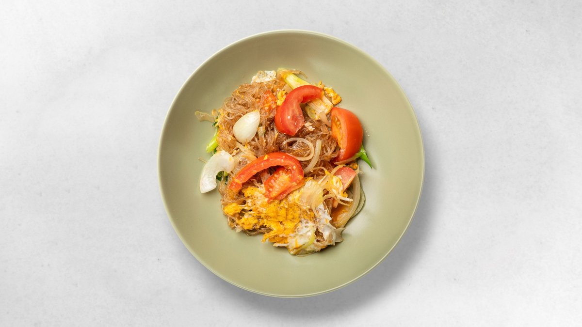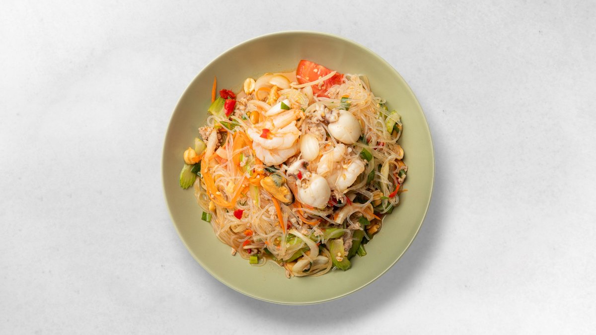Glass noodle salad, seafood, minced pork, onions, tomatoes, coriander, chili, euro grass