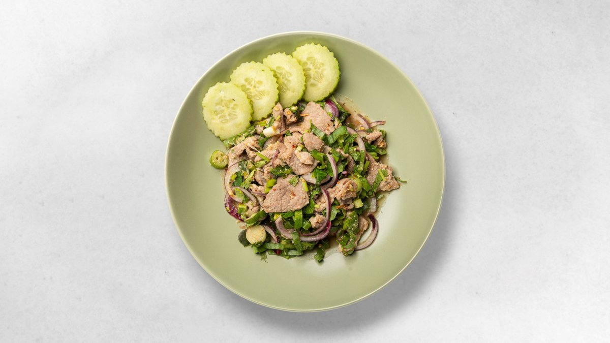 Thai herb salad, meat, shallots, mint, euro grass, chili powder, roasted rice grains