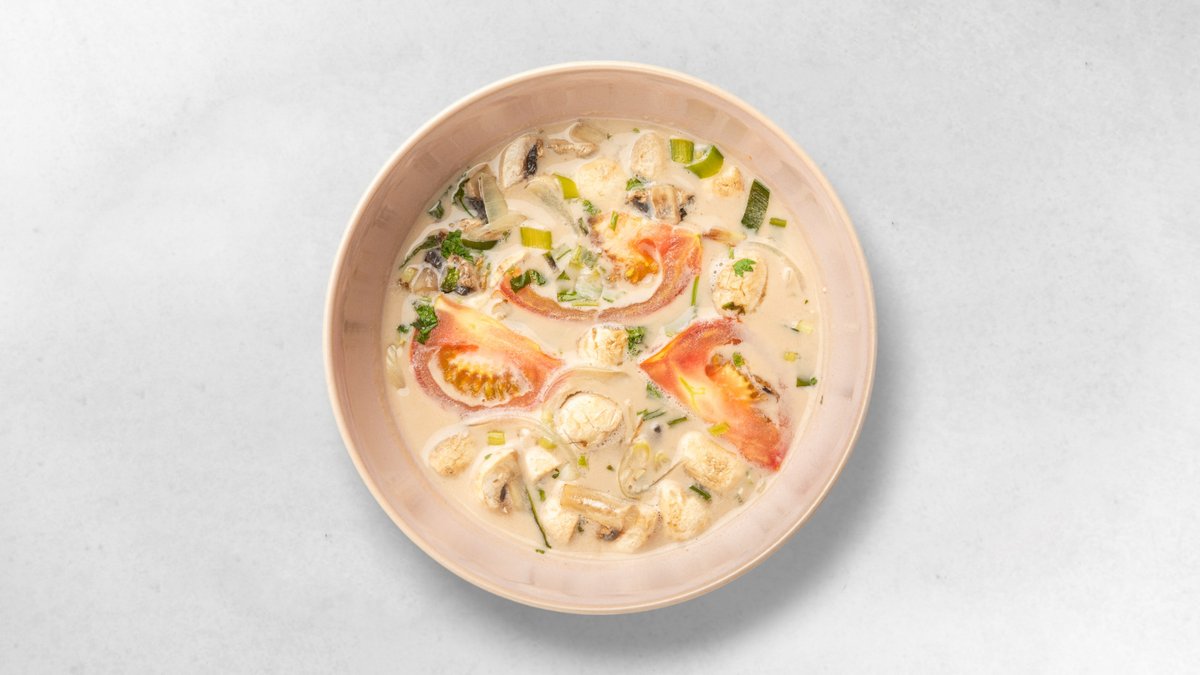 Coconut milk soup, galangal, lime leaves, lemongrass, tomatoes, onions, champignons, coriander