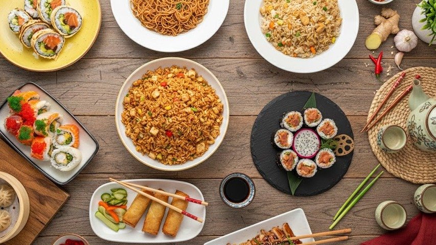 Traditional Asian dumplings, starters and delicious salads