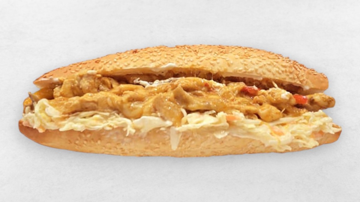 mit paniertem Hühnerfleisch, Paprika, Mais, Champignons , Kashkaval Käse, Colslaw, Mayonnaise und Chillisouce