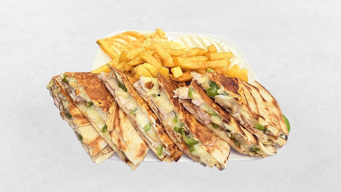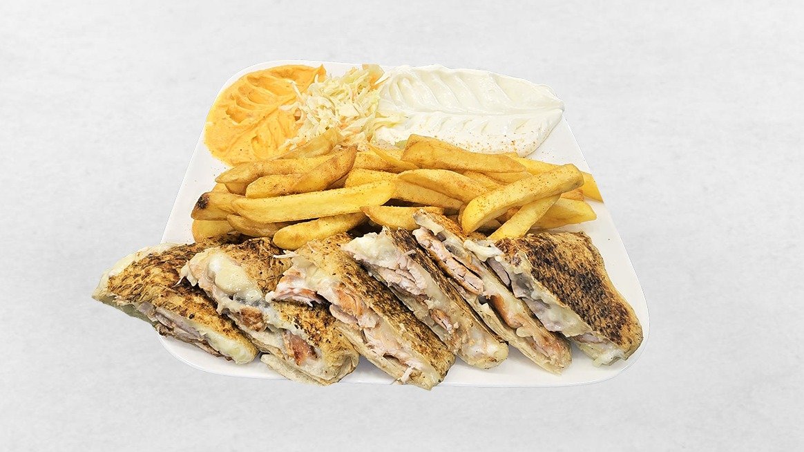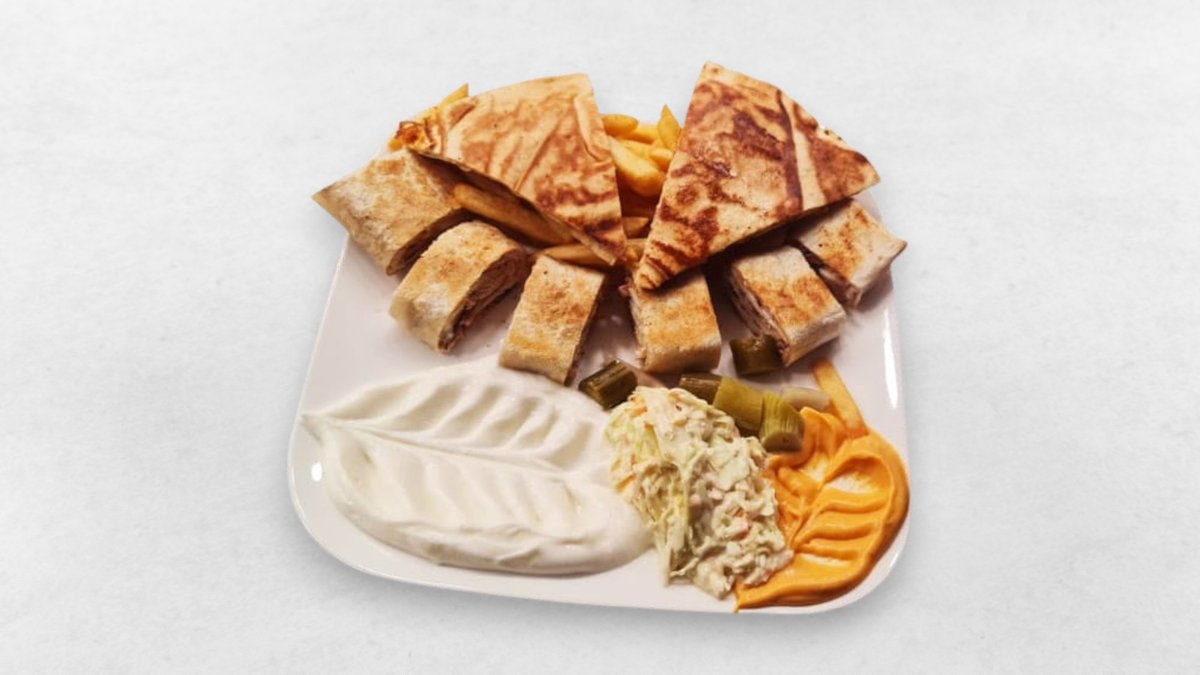 mit Schawarma Hühnerfleisch, Knusprige Fladenbrot, Coleslaw, Knoblauchsauce, Champignons, Kashkaval Käse, Essiggurken und Pommes frites