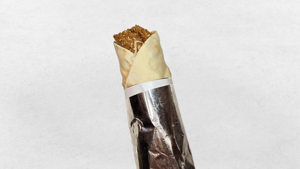 Falafel Wrape mit Eisbergsalad, Tahini, Essigrübe, Tomaten und Gürcken.