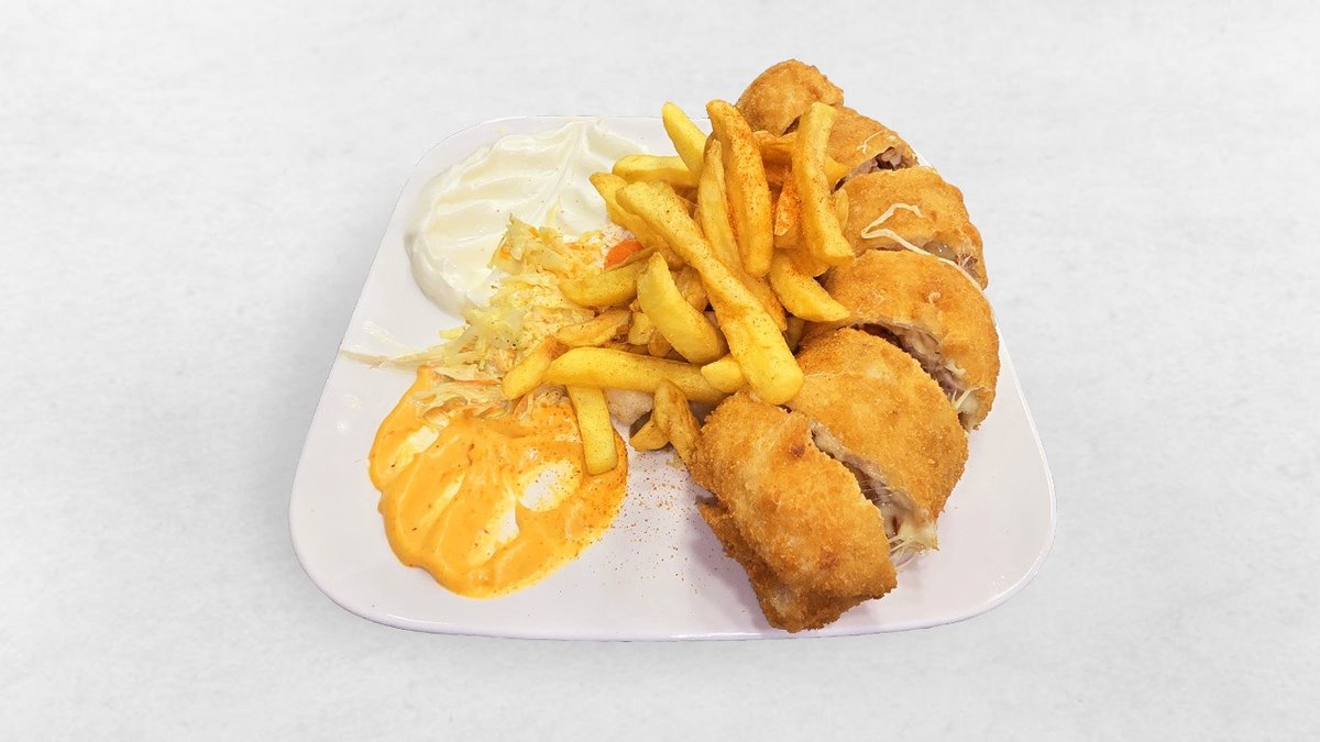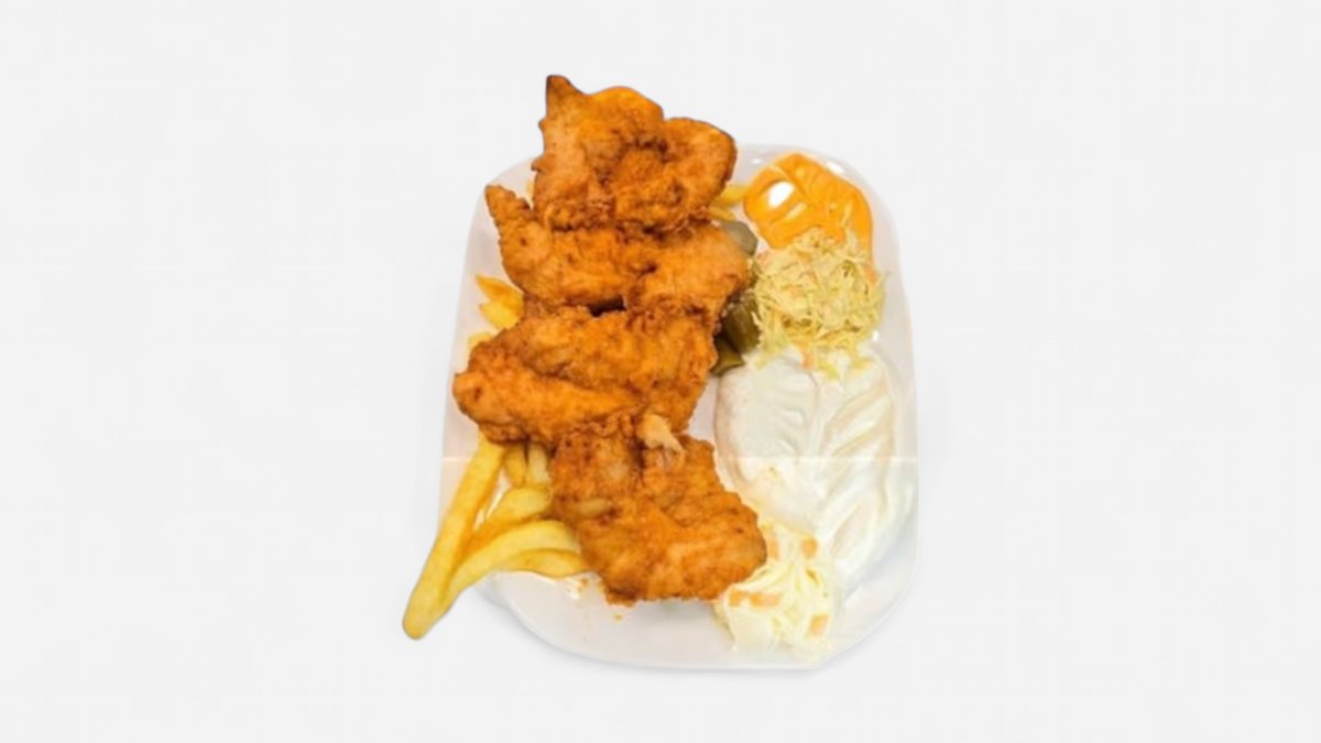 Paniertes Hühnerfleisch, Paprika, Mais, Champignons, Kashkaval Käse, Colslaw und Mayonnaise