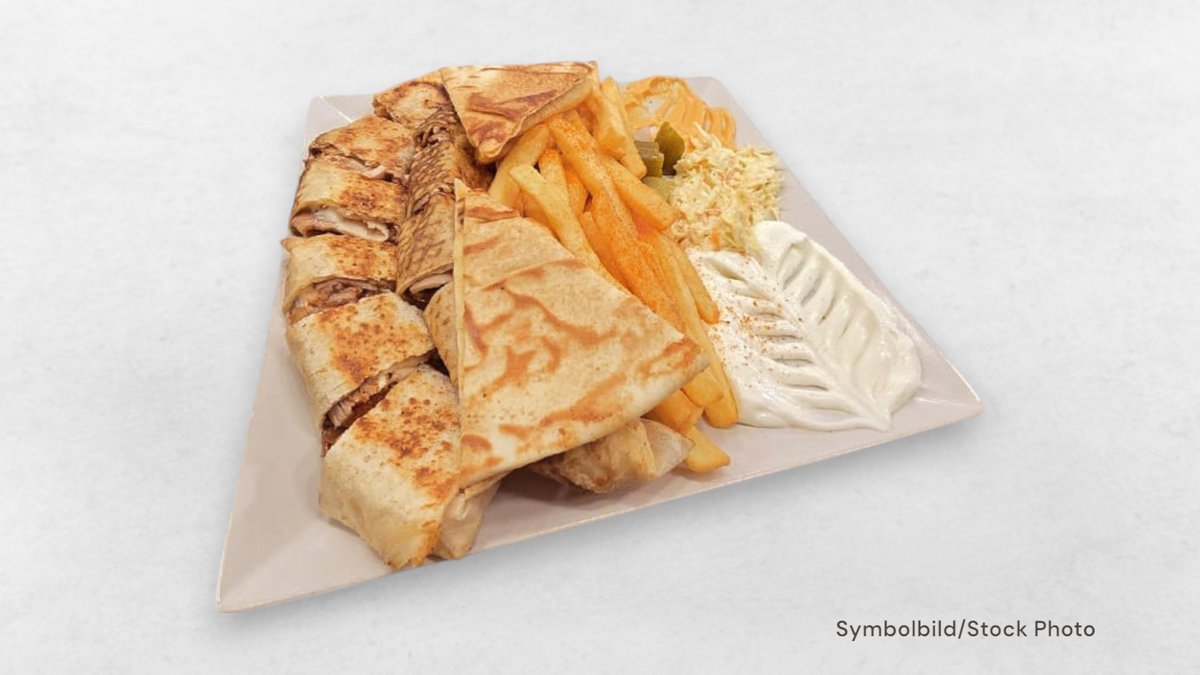 mit Schawarma Hühnerfleisch, Fladenbrot, Coleslaw, Knoblauchsauce, Champignons, Kashkaval Käse, Essiggurken und Pommes frites