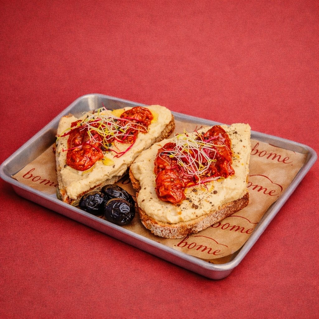 Sauerteigbrot von Joseph Brot ,, Hummus, Granatapfel Souce , Schnittlauch, Chilli Flocken , Getrocknete Tomaten, Oliven