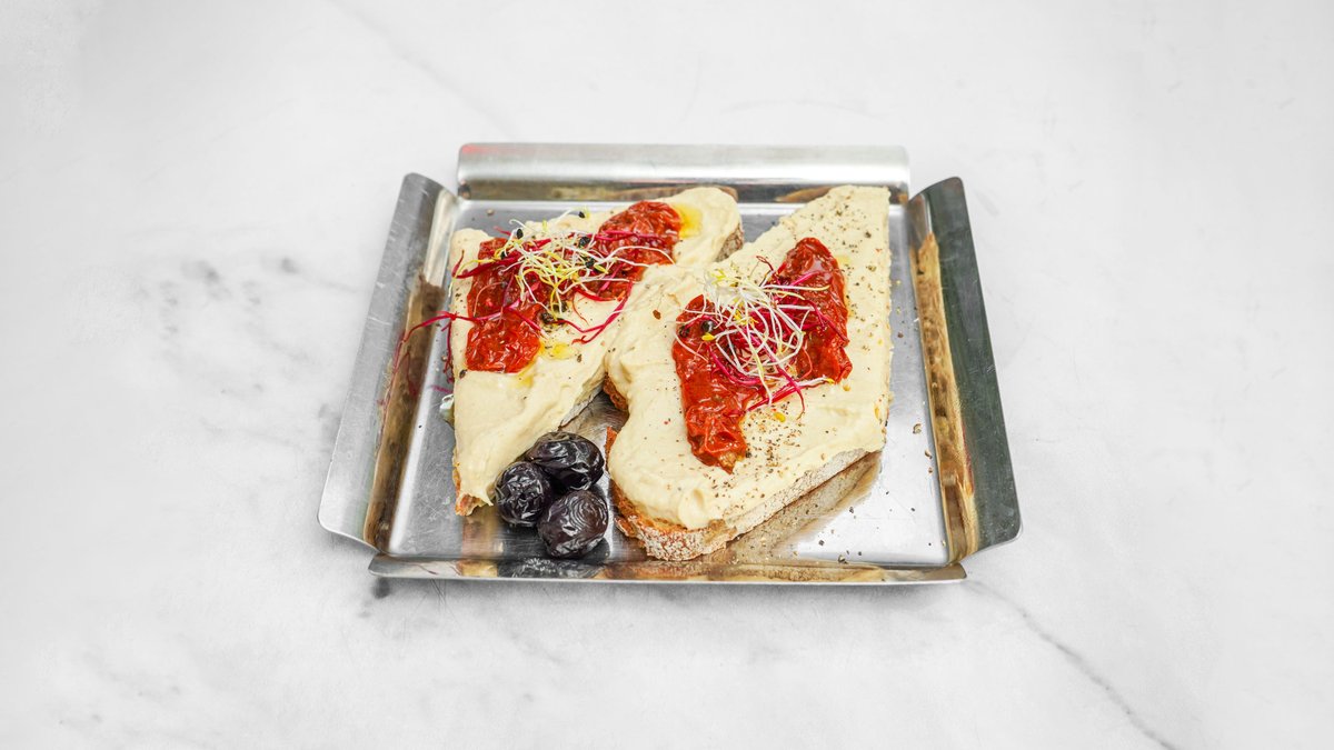Sauerteigbrot von Joseph Brot ,, Hummus, Granatapfel Souce , Schnittlauch, Chilli Flocken , Getrocknete Tomaten, Oliven
