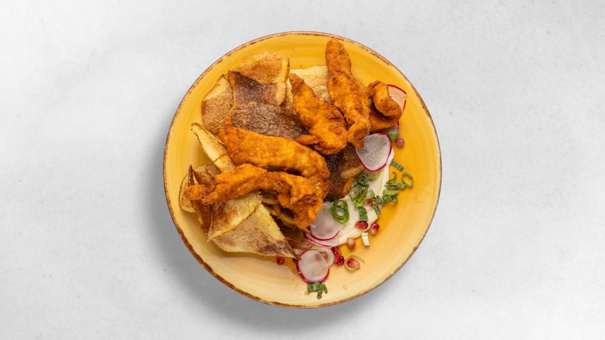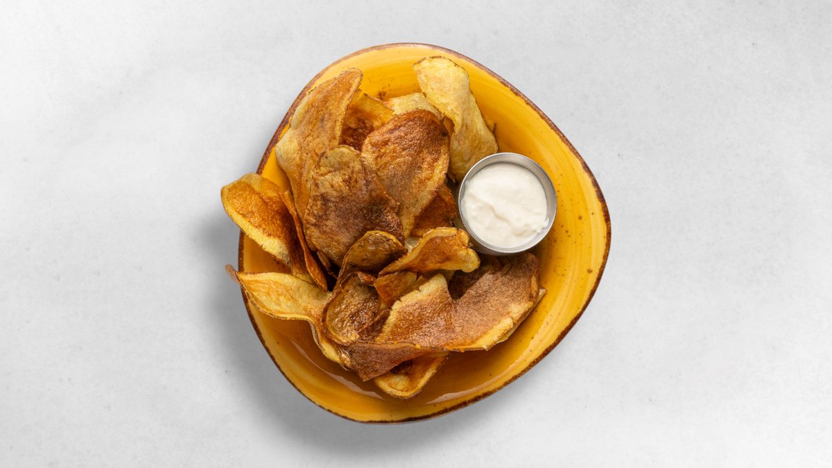 Bunte Chips, Trüffelmajonnais, Radieschen, Jungzwiebel, Granatapfelkerne