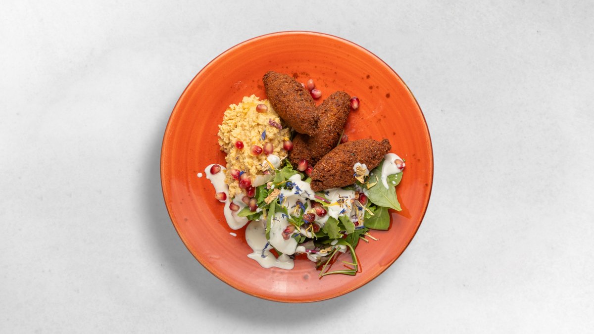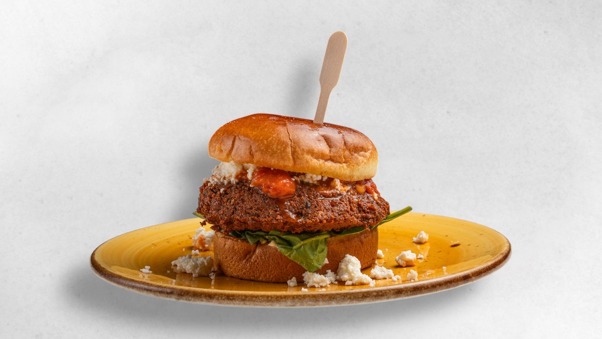 Goldbraun gebackenes Falafelpatty, Mayonnaise, junger Spinat, Tomaten-Paprikaragout, Schafkäse, Olivenöl