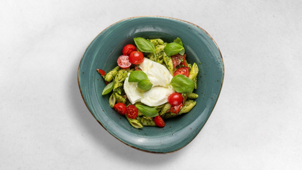 Handgeschöpfter Büffelmozzarella, Basilikum, Tomate, Zucchini, Paprika, getrocknete Tomate, Jungspinat Pesto, Olivenöl