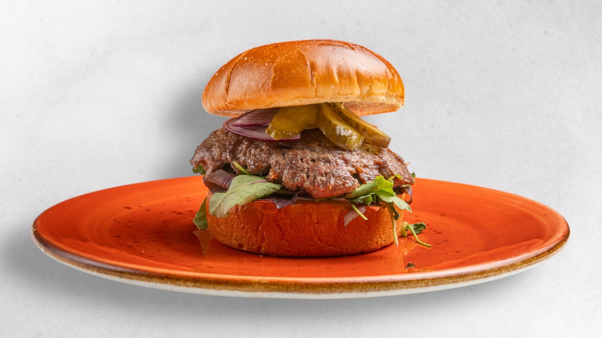 100% Waldviertler Weiderind, Mayonnaise, Pflücksalat, Tomate, roter Zwiebel, Essiggurke