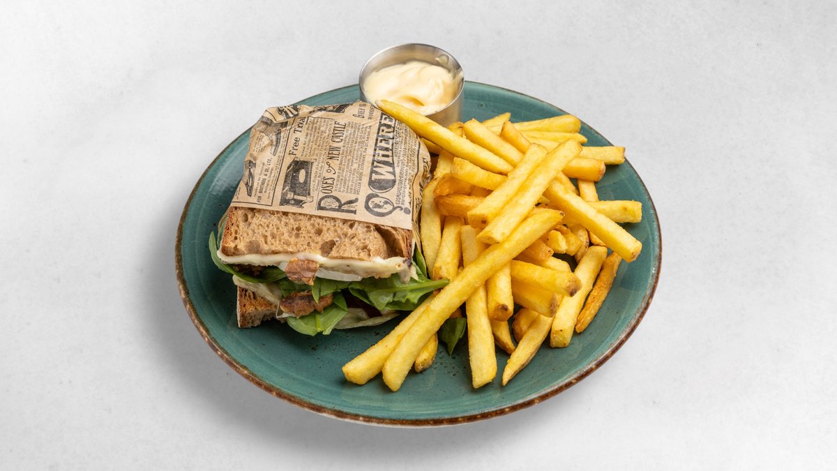 Brie Gauda, junger Spinat, karamellisierte Rotweinzwiebeln, Walnüss, Trüffelmayonnaise, Pommes Frites
