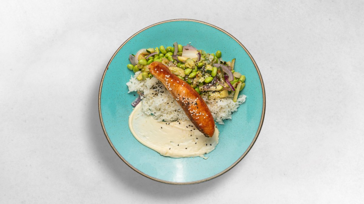 Pak Choi, Jungzwiebel, Zucchini, Edamame, Ingwer, Reis, Sesam