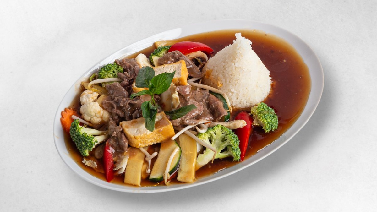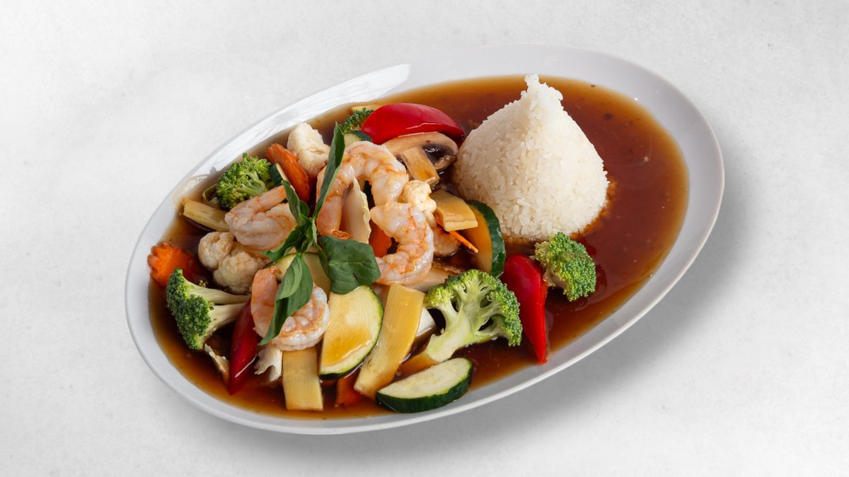 Thailändisches Gemüse, gebraten, Ingwer, Champignons, Basilikum, Soße deiner Wahl