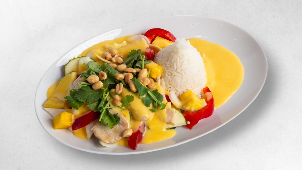 Zartes Hühnerfleisch, Mango-Kokosmilch-Soße, Paprika, Zwiebel, Erdnüsse, frischer Koriander