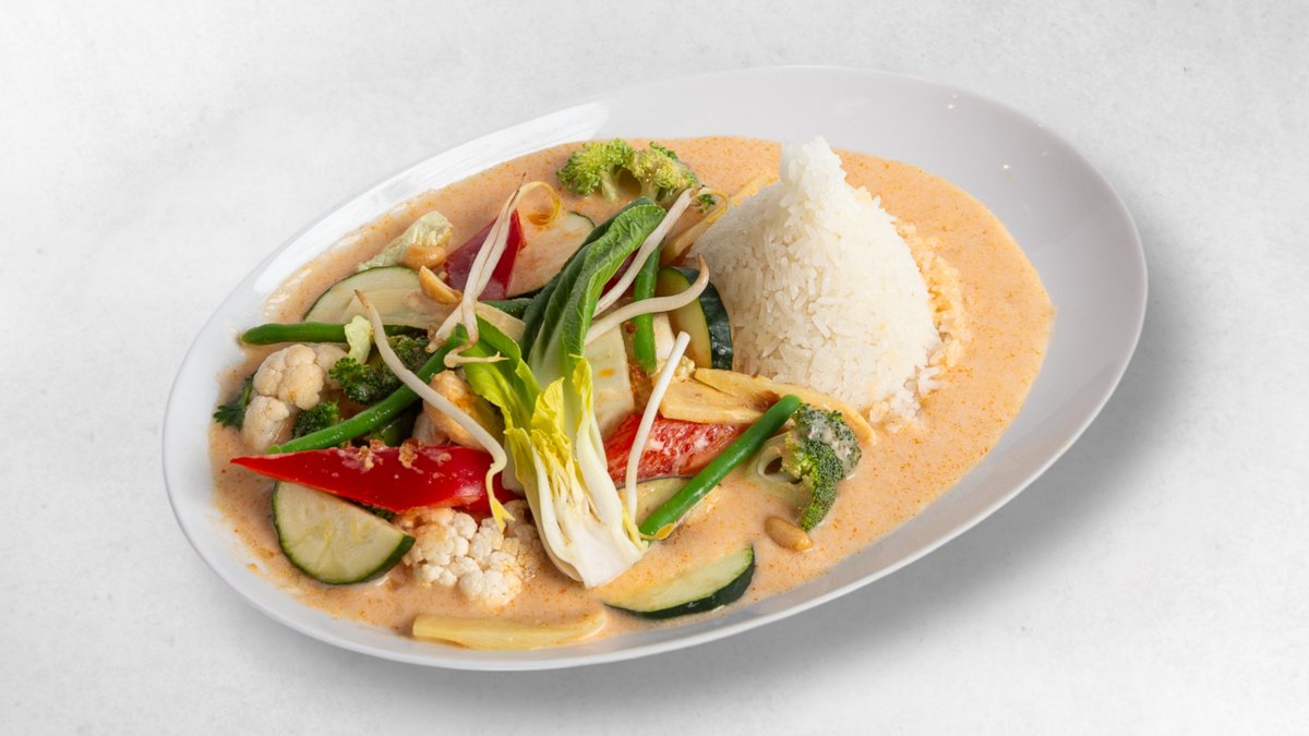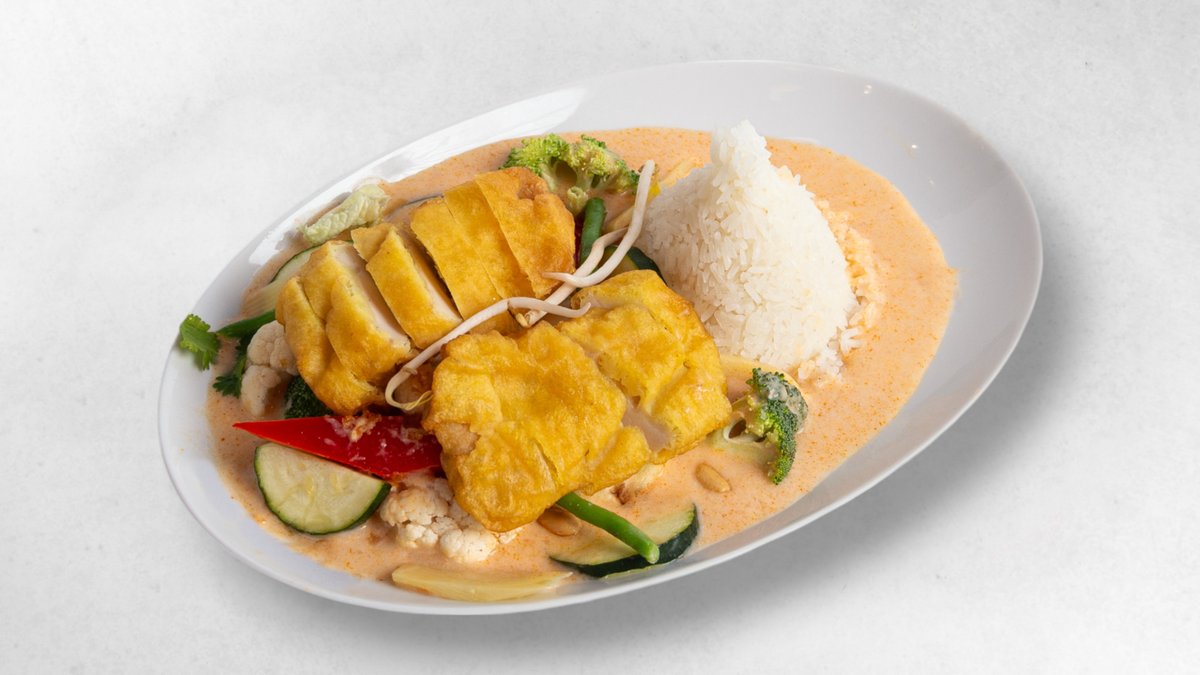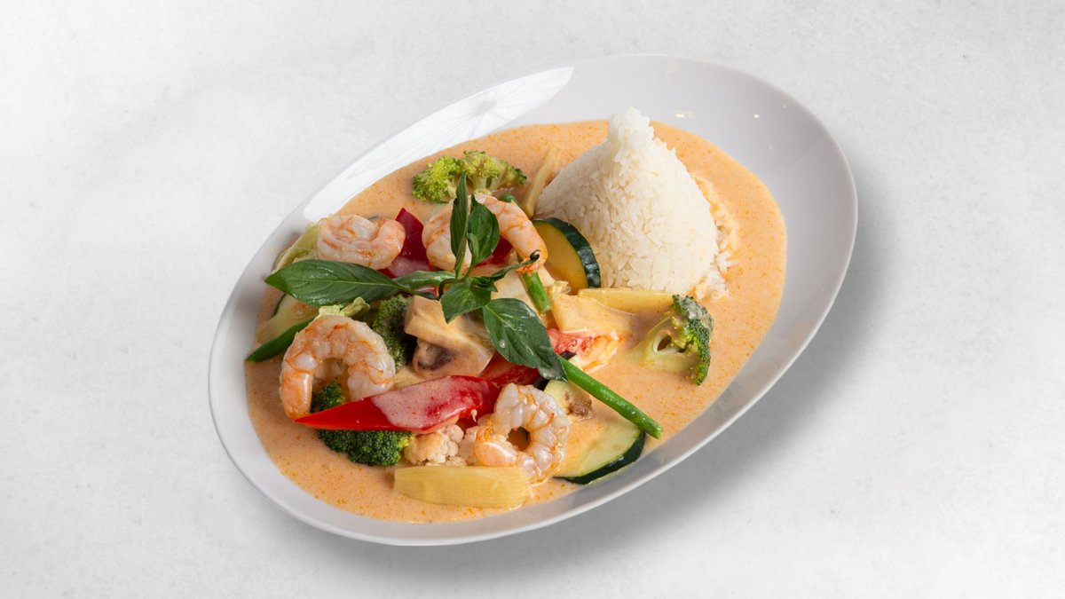 Gebratenes Hühnerfleisch, Panäng Thai Curry, Paprika, Peperoni, Zwiebel, Erdnüsse, Basilikum, Kokosmilch