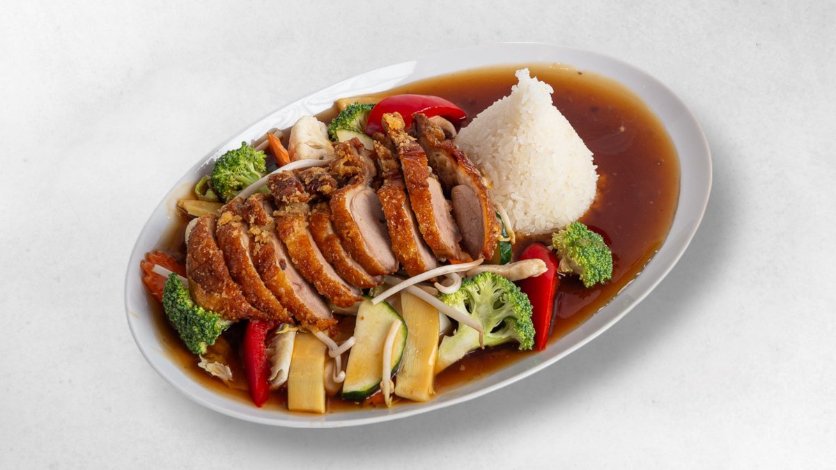 Knusprige Ente, 8x Sorten Saisongemüse, extra pikante Soße