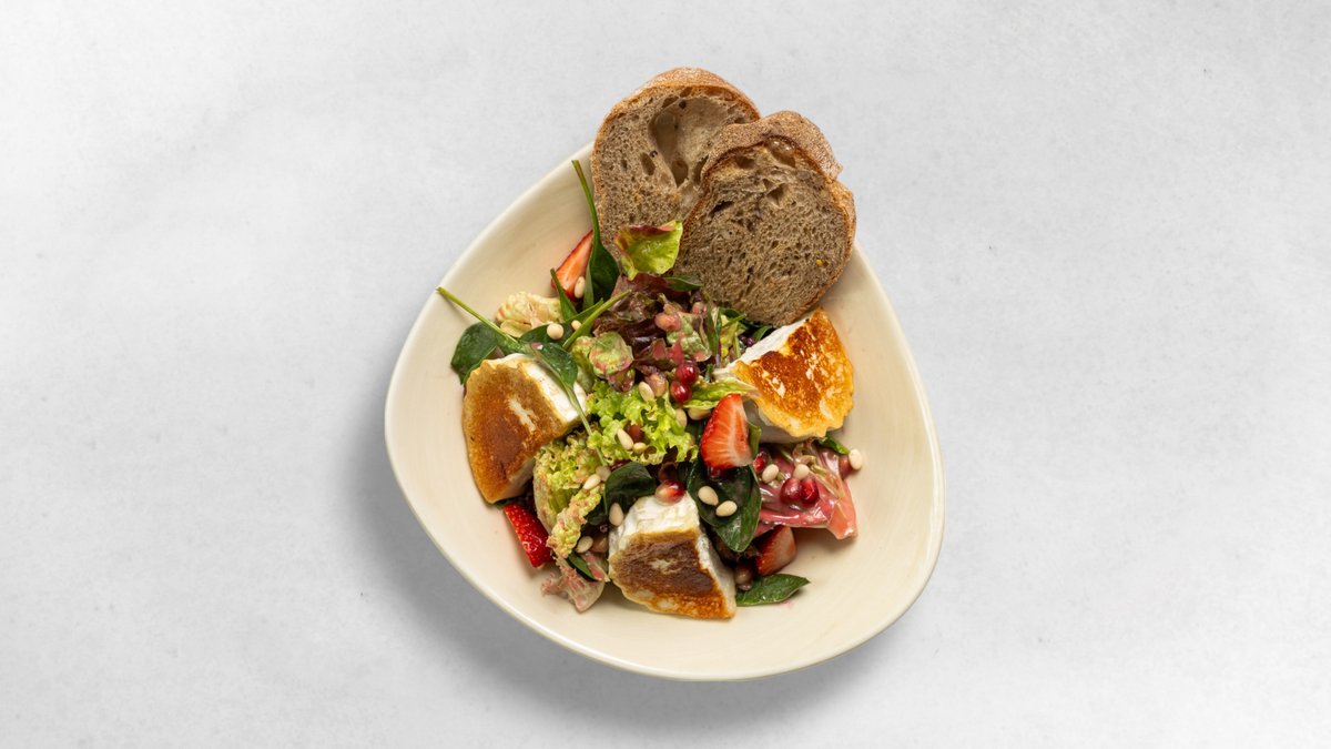 Pinienkernen, Himbeerdressing, Baby Spinat, Erdbeeren, Granatapfelkerne, Hausbrot