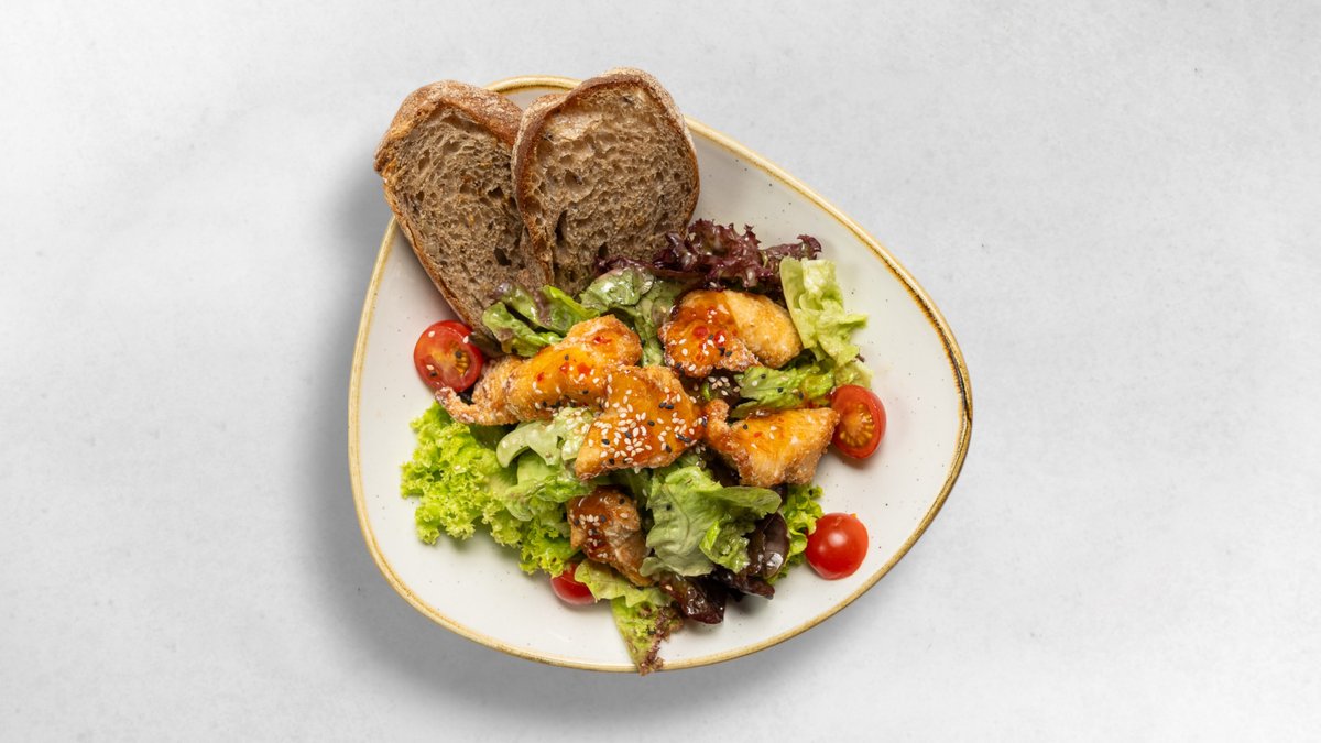 Panierte Hühnerstreifen, Honig-Chili-Soße, Blattsalat, Senfdressing, Tomaten, Hausbrot