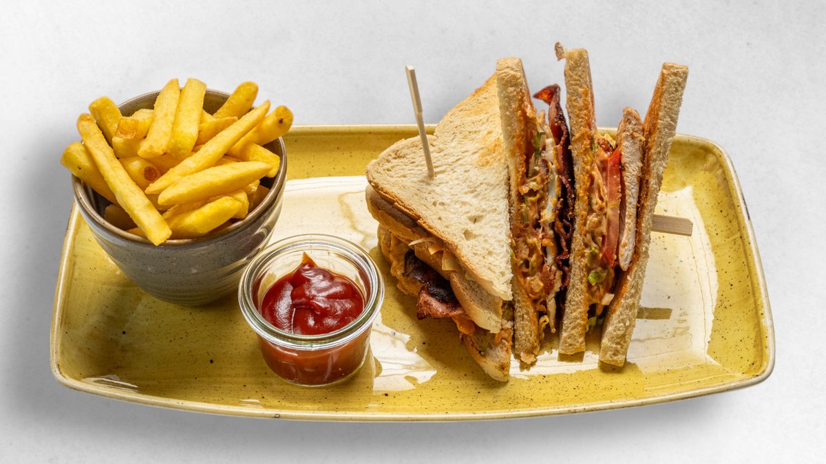 Triple-Sandwich-Toast, gegrillte Hühnerbrust, knuspriger Speck, Tomaten, Spiegelei, Pommes, hausgemachte-Soße