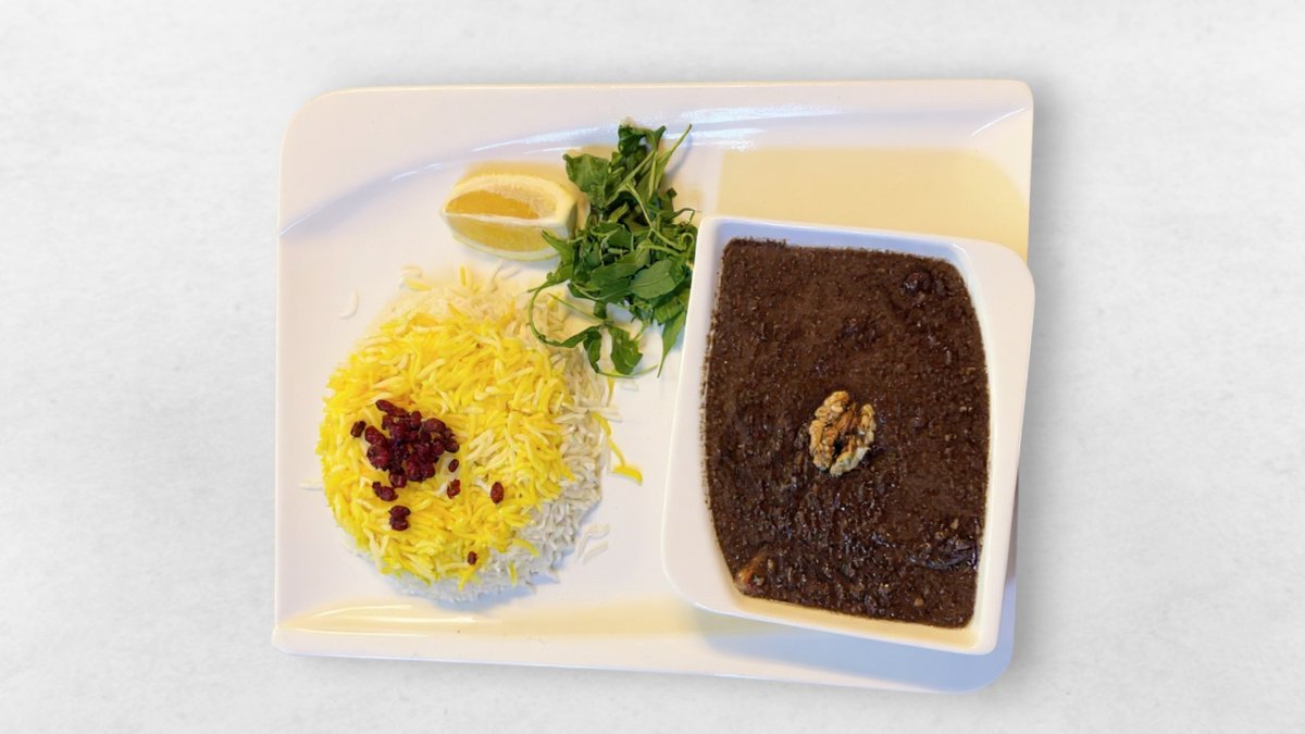 Ground walnuts, pomegranate molasses, saffron rice