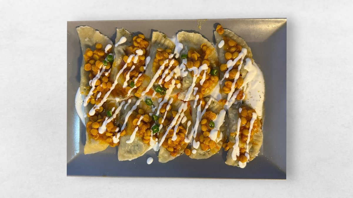 Stuffed dumplings, chives, chakni, red beans, yogurt, garlic