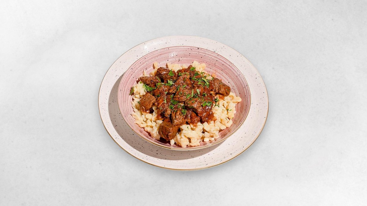 Homemade spaetzle, beef, onions, bell pepper powder, garlic, caraway, marjoram, mustard