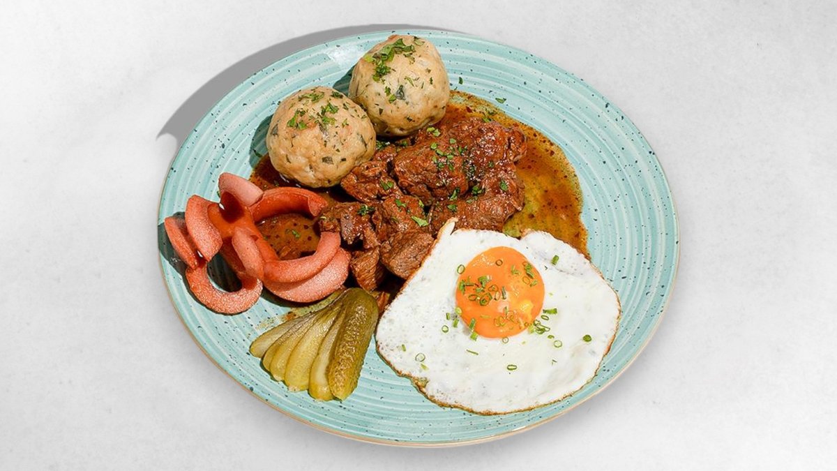 Bread dumplings beef, onions, bell pepper powder, garlic, caraway, marjoram, frankfurters, mustard, eggs, pickles, homemade bread dumplings