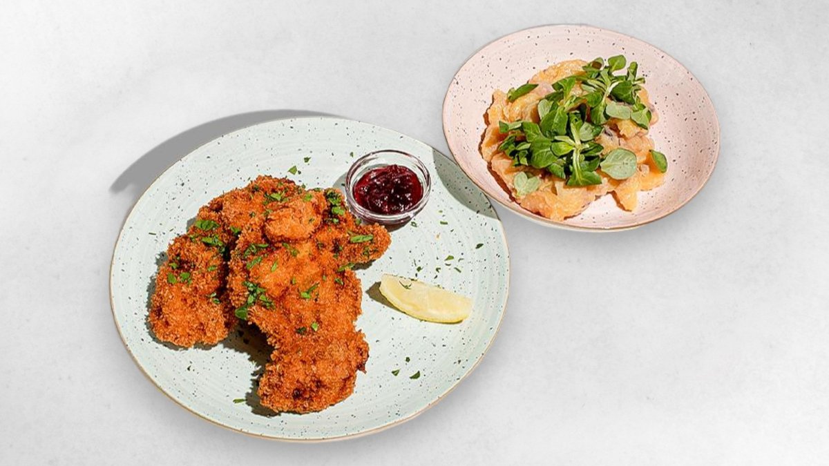 Corn chicken leg in yoghurt marinade, breadcrumbs, lamb's lettuce, cocktail tomatoes, pumpkin seed oil dressing, cranberries