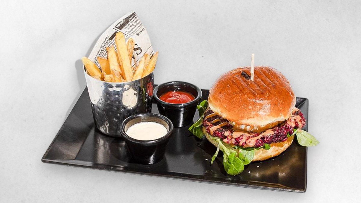 French fries, beetroot patties, grilled goat cheese, tomatoes, pickles, caramelized onions, homemade burger sauce, lettuce leaf