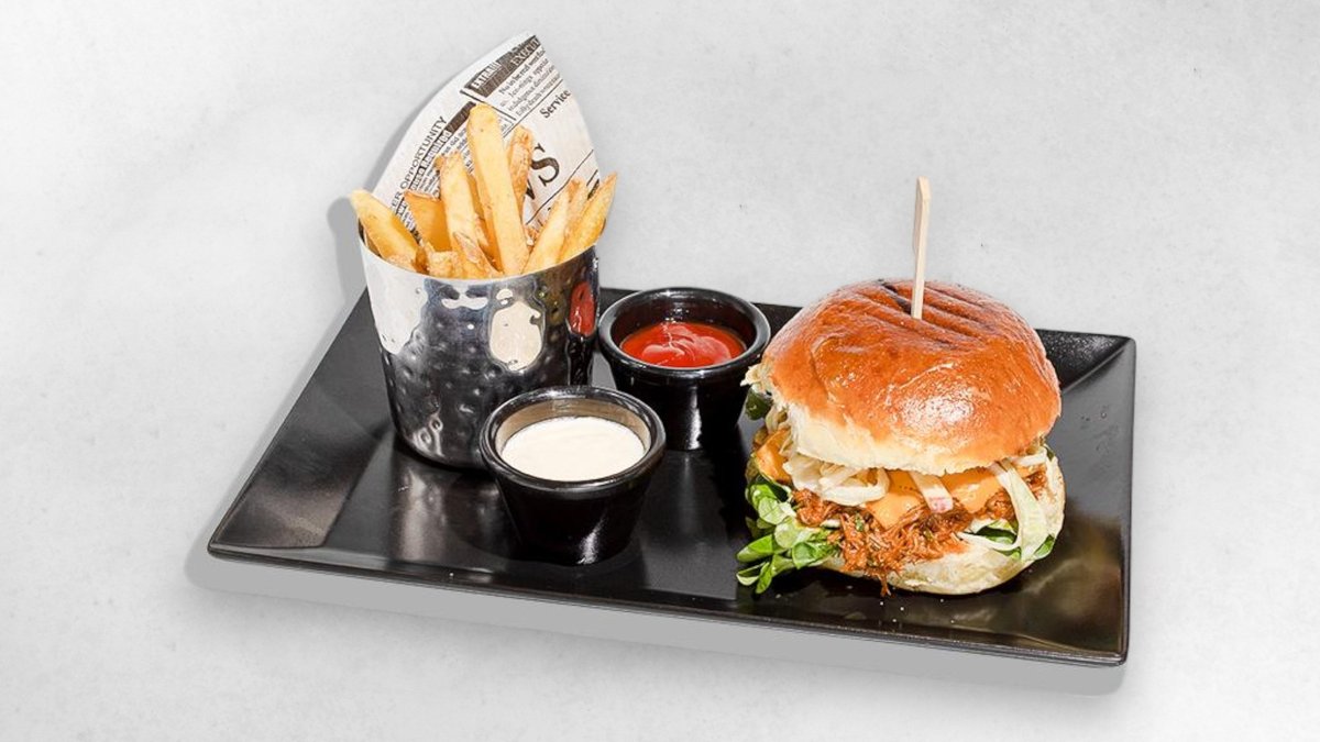 French fries, homemade pulled chicken, coleslaw, homemade burger sauce, lettuce leaf