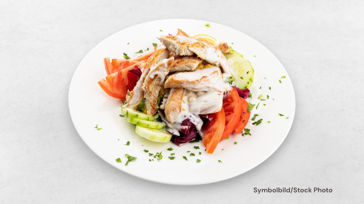 Hähnchenfilet, Salat, Tomate, Zwiebel, Gurke, Haus-Soße