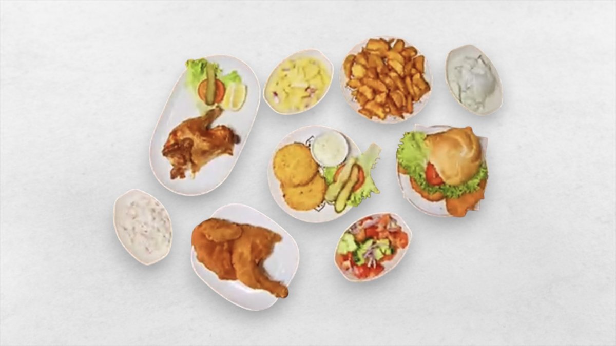 Salat, Zwiebeln, Tomaten, Essiggurken, Ketchup, Mayonnaise, Scharfe-Soße