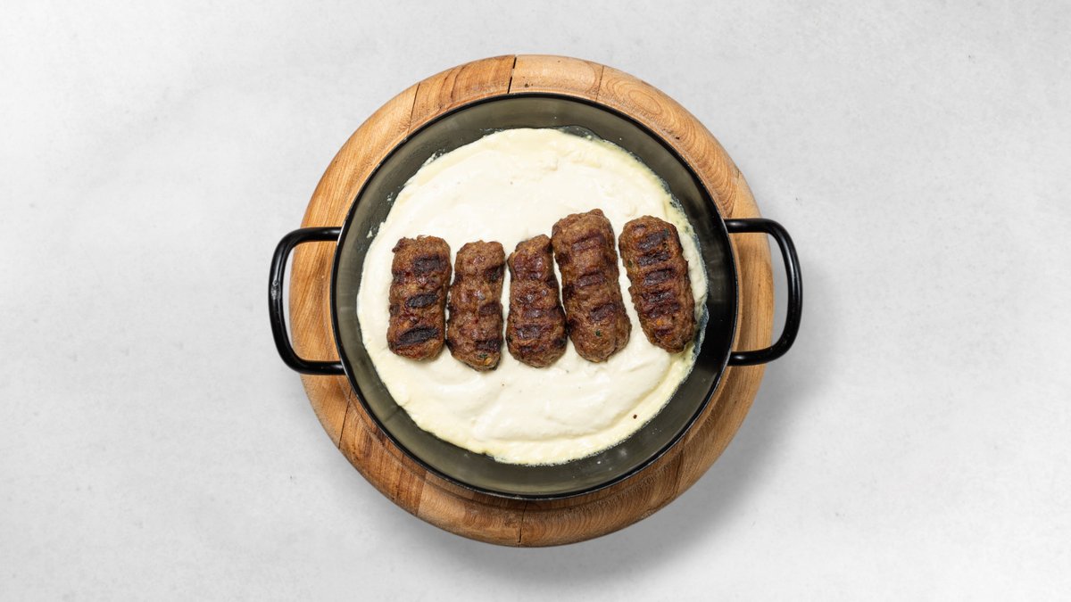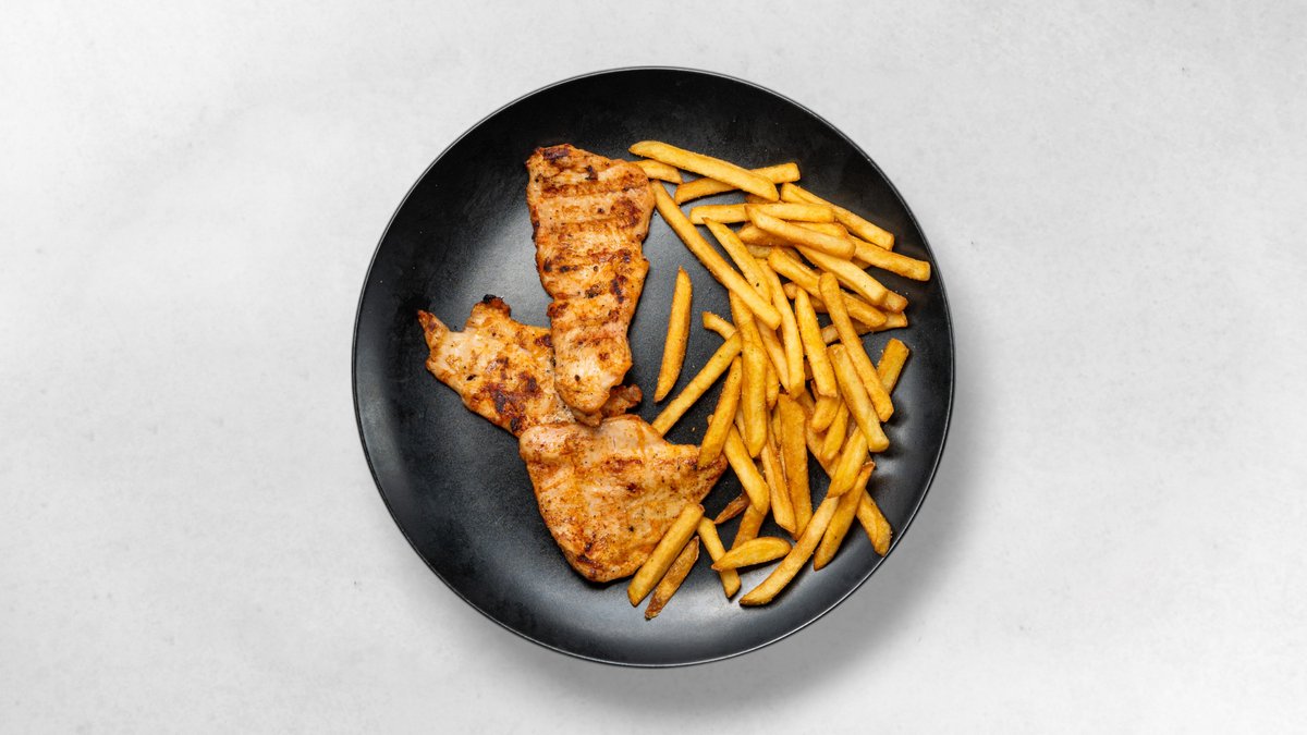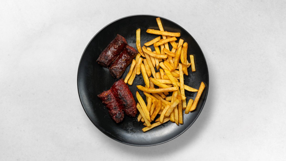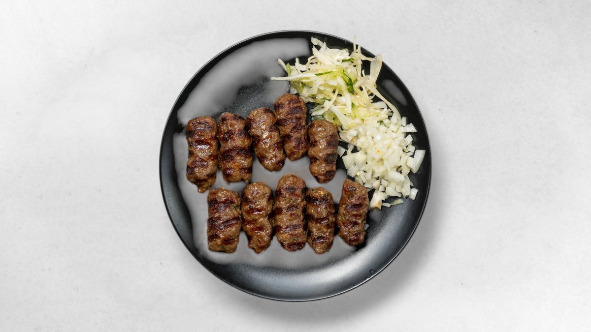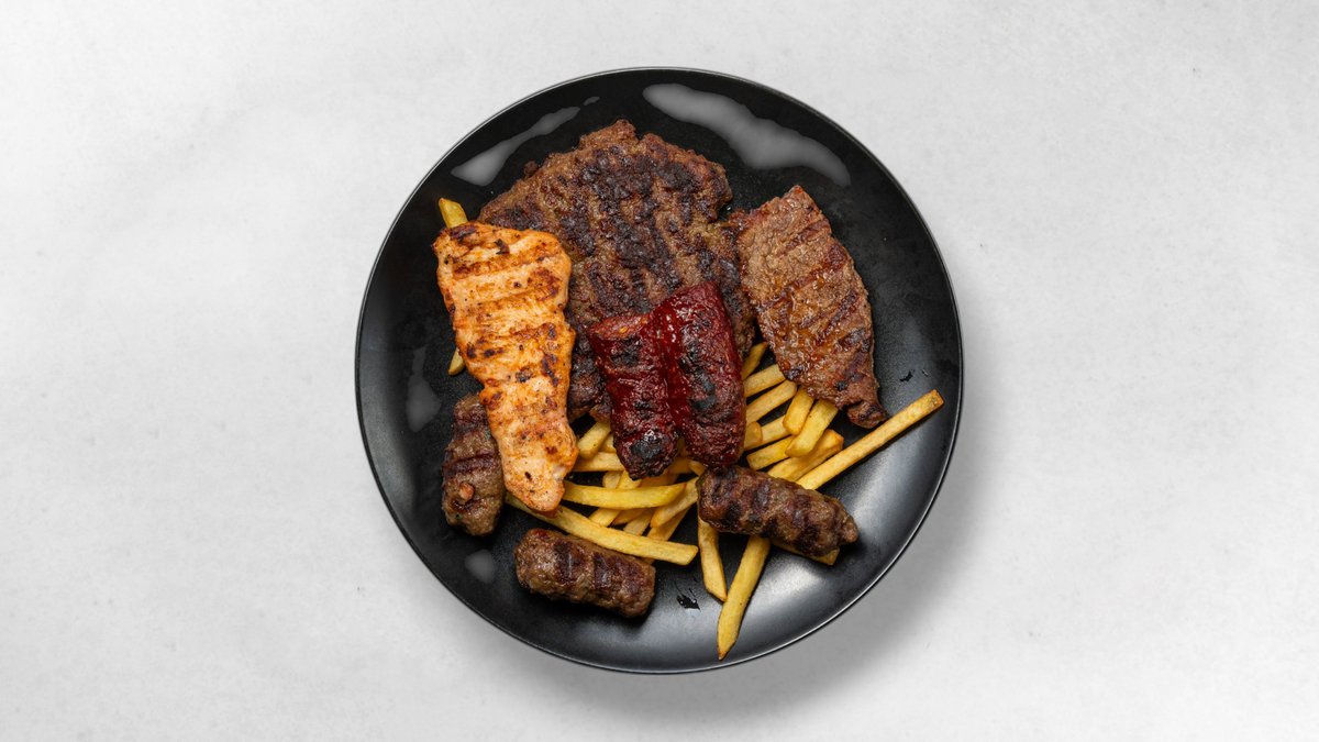 3 Cevapcici, 1 Pljeskavica, 1 Bratwurst, 1 Hühnerfilet, 1 Rinderfilet, 1 Pommes frites