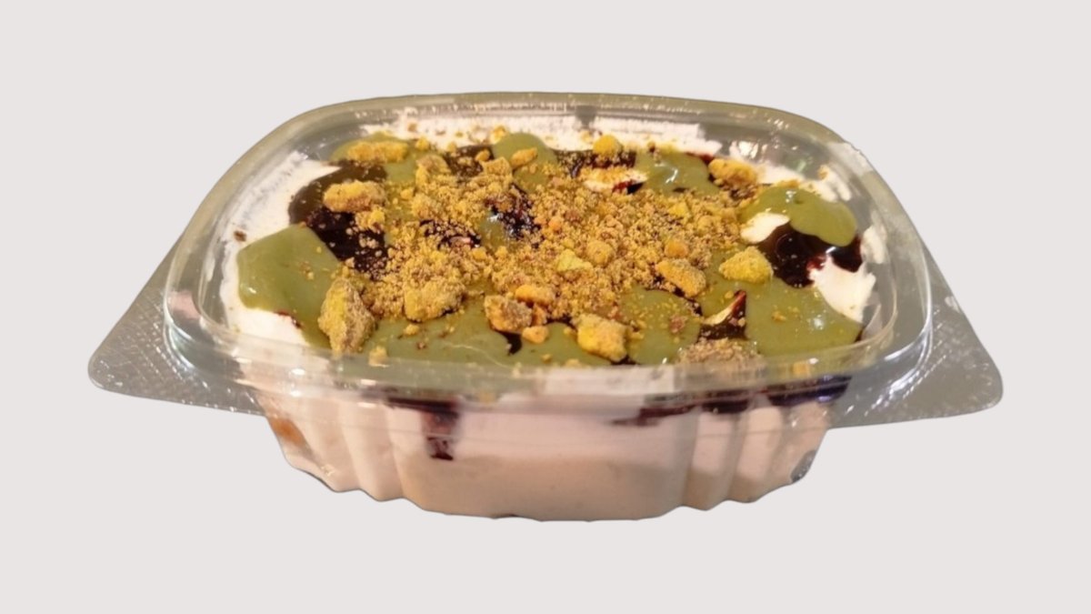 Leckeres Tiramisu mit Schokosauce, Pistaziencreme & Pistazienstückchen.