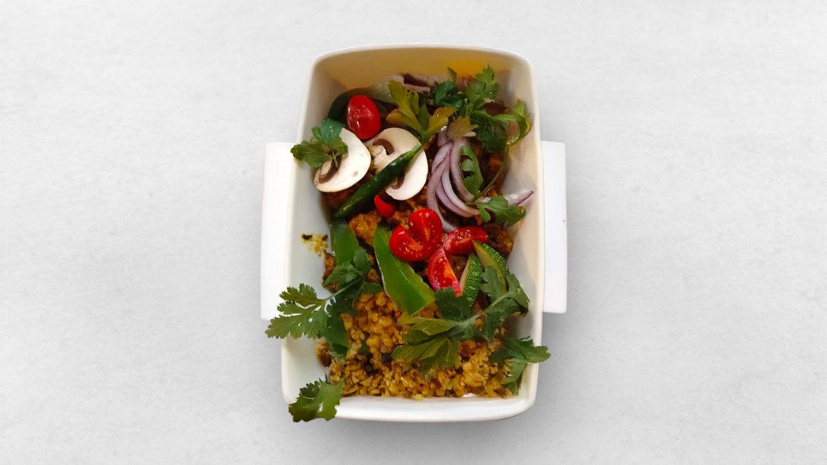 Hühnerfleisch, Curry, Zwiebelringe, Tomatenscheiben, scharfer Pfefferoni