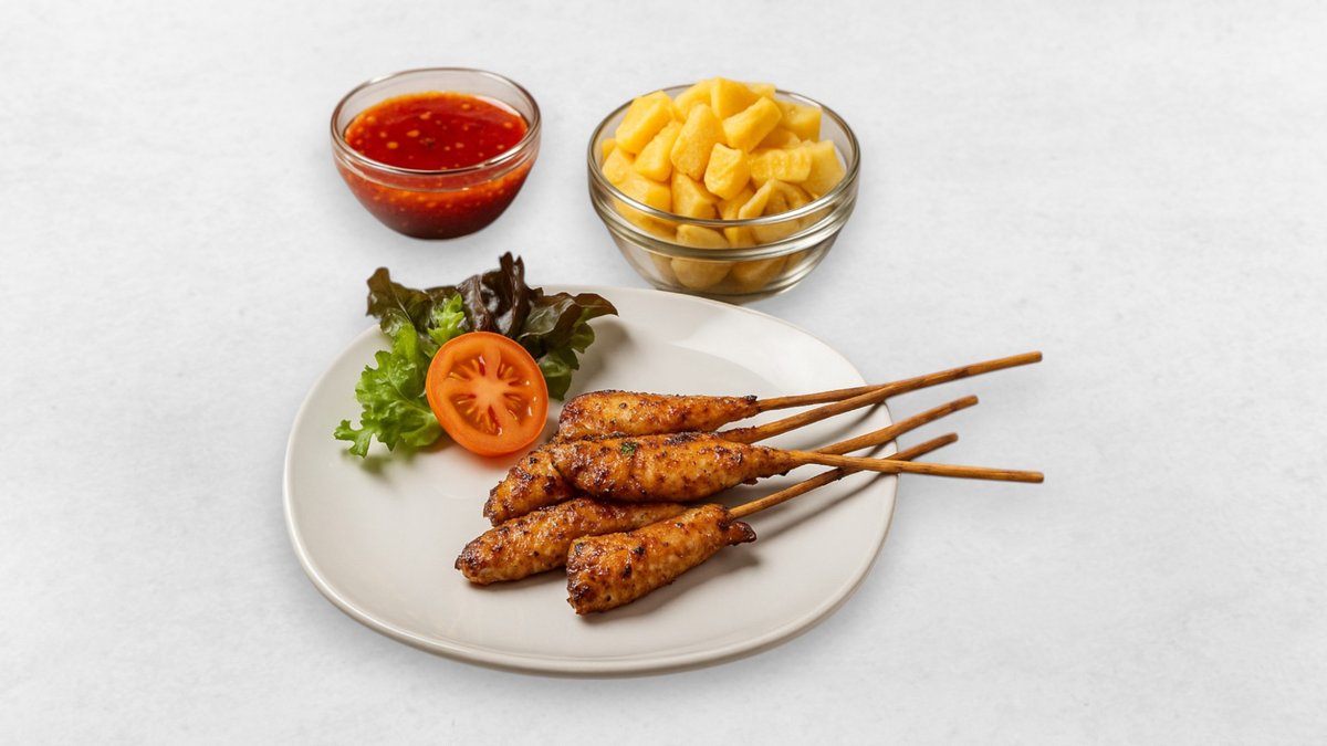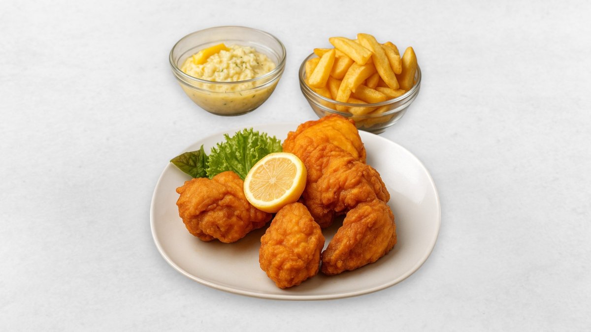 5 Hühnerspießchen, Pommes, Soße nach Wahl