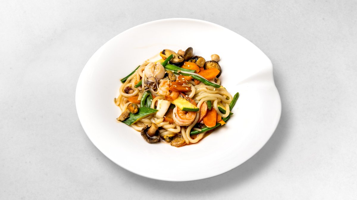 Dicke Nudeln, Weizenmehl, gewürzte Meeresfrüchte, Tofu, Hühnerfleisch, Rindfleisch gebraten