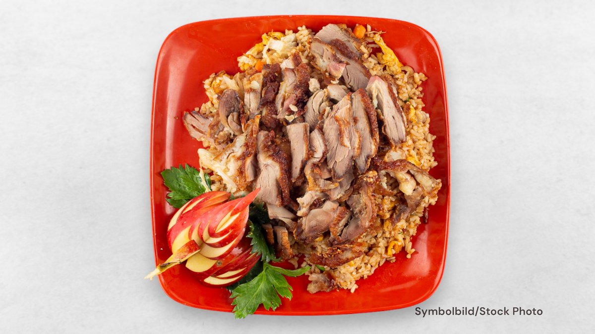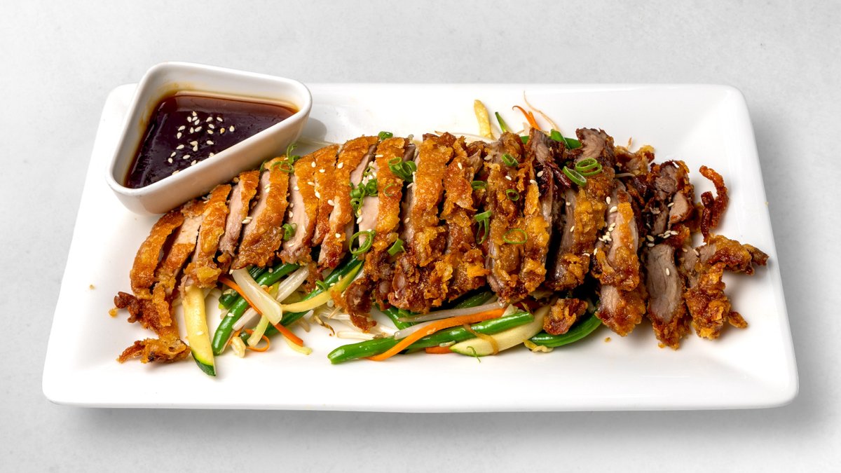 Knusprig frittierte Ente, gebratener Eierreis, Teriyaki-Soße