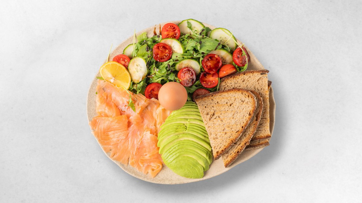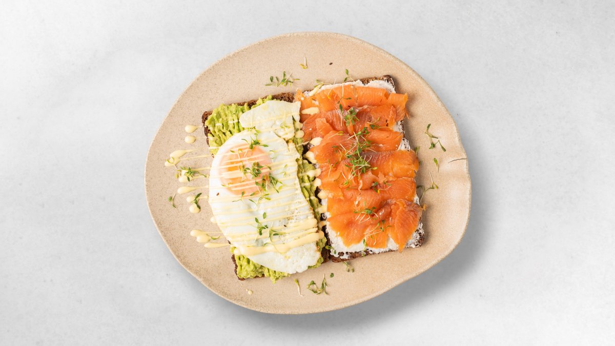 2x Scheiben Vollkornbort, Avocado-Aufstrich, Räucherlachs, 0,25l frisch gepresster Orangensaft