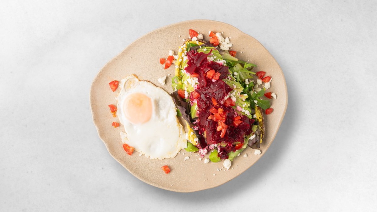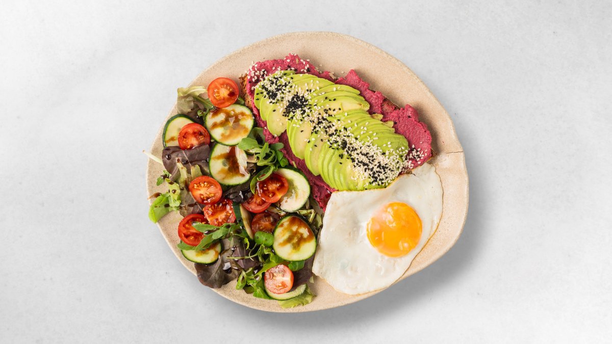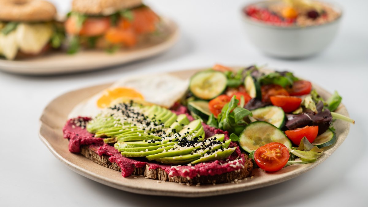 Bauernbrot, Rote-Rüben-Aufstrich, Avocado, Mix-Salat, Spiegelei, Sesam, Schwarzkümmel, 0,25l frisch gepresster Orangensaft