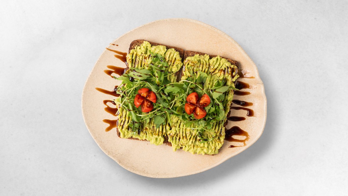 2x Scheiben Vollkornbrot, Avocado-Aufstrich, Rucola, Kirschtomaten, Granatapfelsirup, 0,25l frisch gepresster Orangensaft