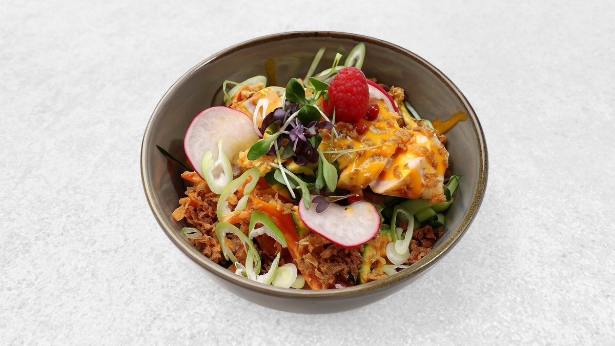 Jasminreis, gegrilltes Rosmarin-Huhn, Avocado Mash, Zucchini, Karotten, Radieschen, Gurke, Granatapfel, Crunchy Onion, Spicy Mayonnaise, frische Himbeeren, Mango-Dressing, Shiso-Kräutern