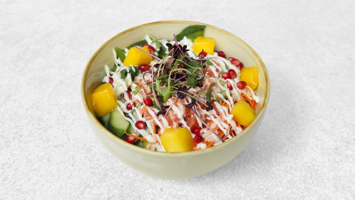 Jasminreis, Räucherlachs, Ponzu-Dressing, Babyspinat, Avocado Mash, Mango, Limetten-Mayonnaise, Gurken, Karotten, geröstete Sesamsamen, Granatapfel, Sesam-Honey-Dressing, Shiso Kräutern