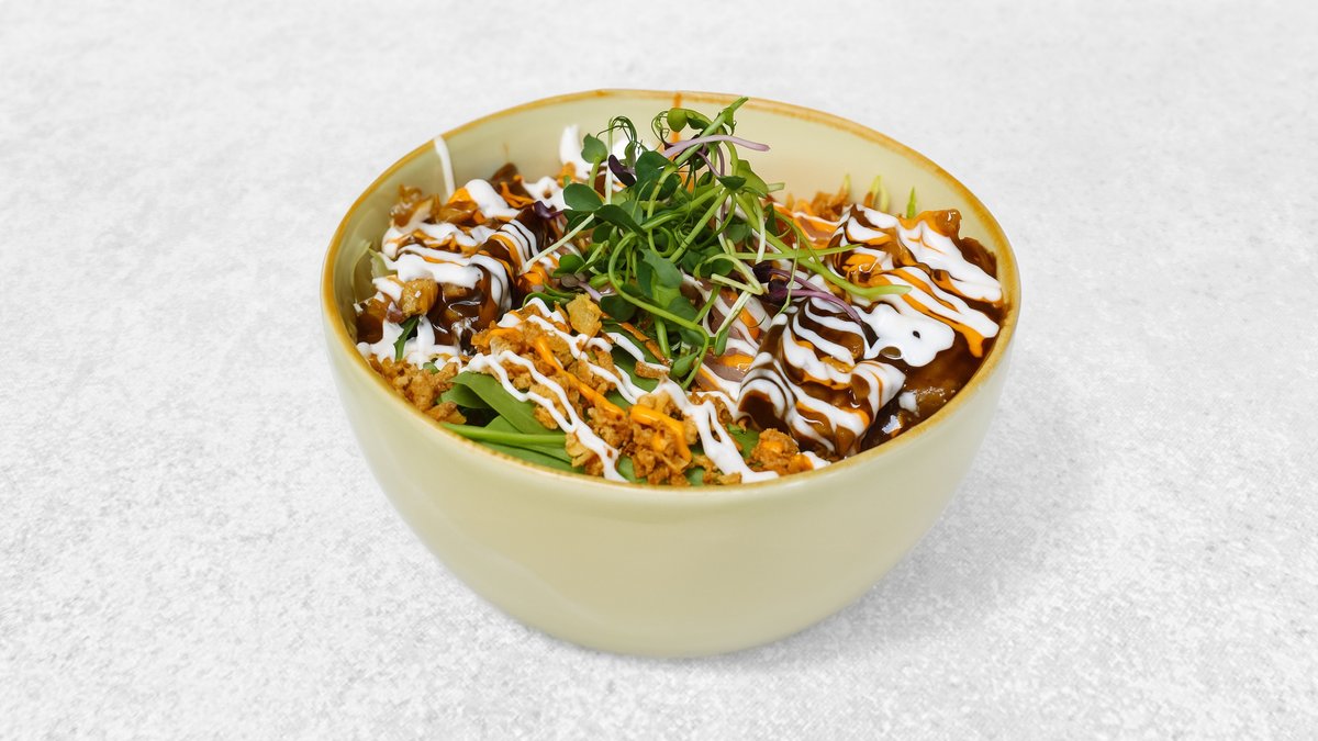 Jasminreis, Roastbeef Medium, Rucola, Zucchini, Karotten, gegrillte Melanzani, Babyspinat, Spicy Hoisin Soße, Crunchy Onion, Truffel Mayo, Spicy Mayo, Shiso Kräuter