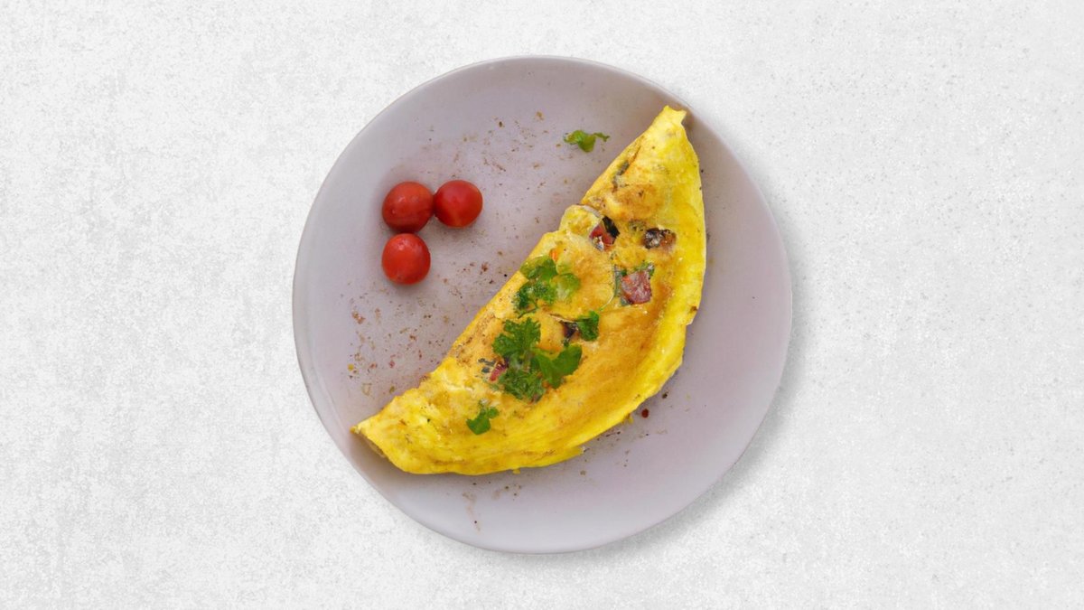 Omelett, 3 Bio-Eiern, Rucola, Cherrytomaten, frische Kresse, Baguette