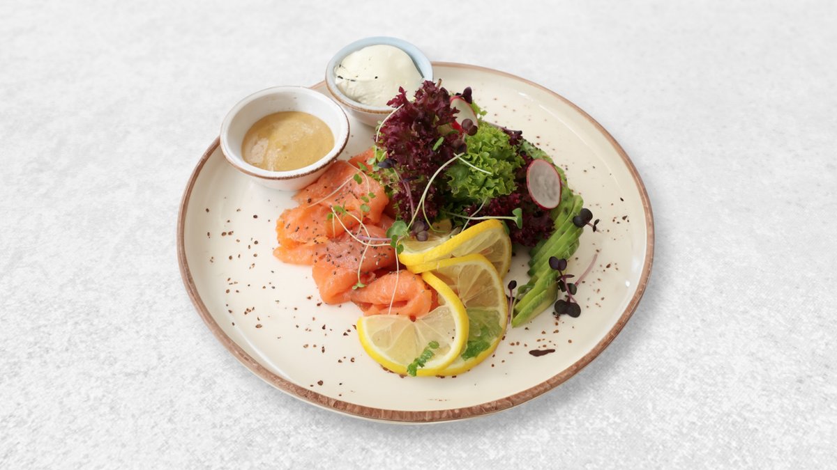 Geräucherter Lachs, Frischkäse, Avocado, Cherrytomaten, bunter Blattsalat, Chiasamen, frische Kresse, Honig-Senf-Dill-Sauce, Bio-Krustenbrot vom Öfferl