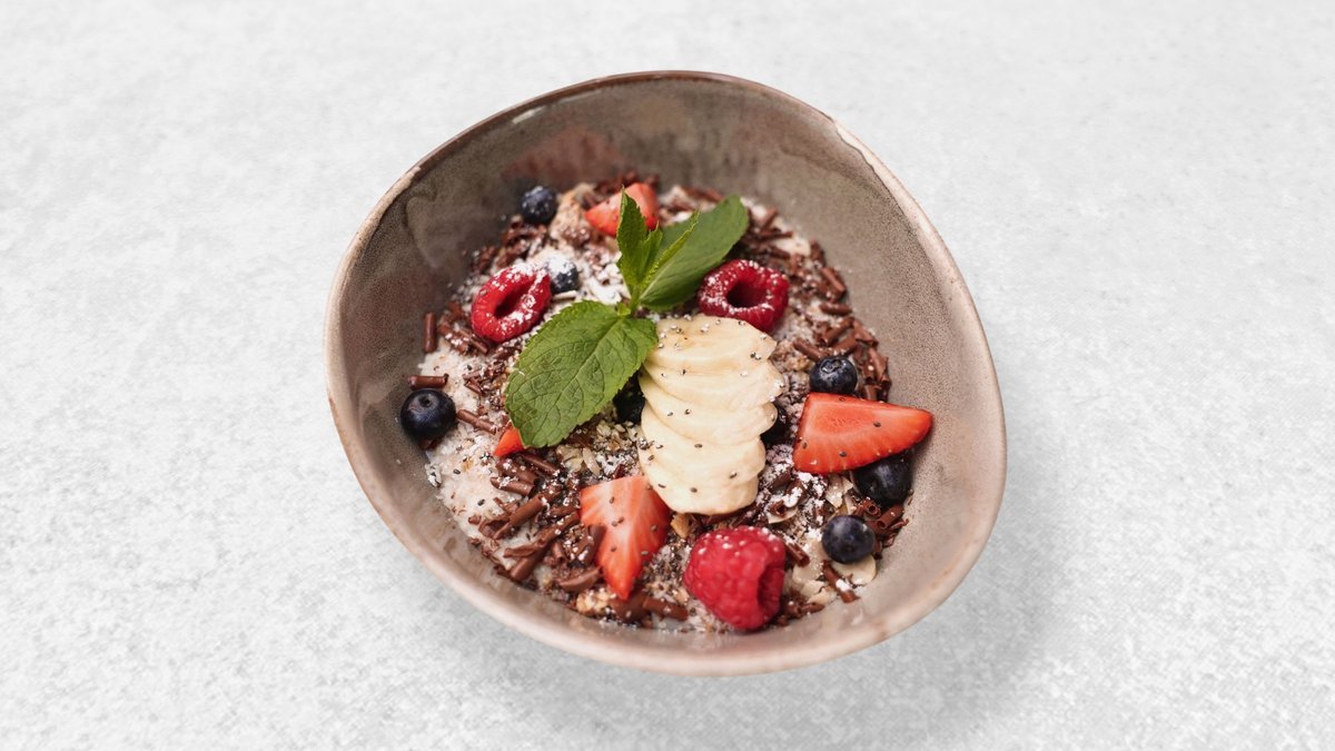 Haferflocken, Kokosmilch, Banane, Beeren, Honig, Schokoladenraspeln