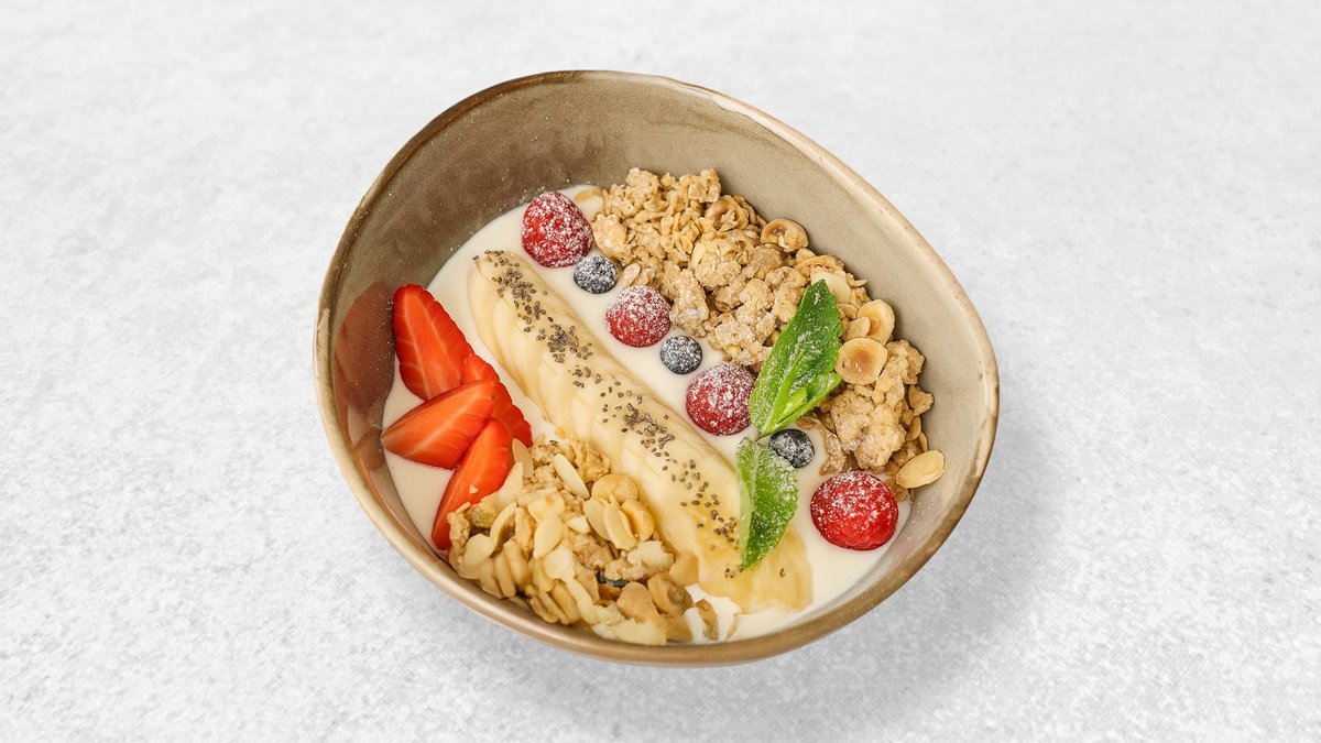 Griechischer Joghurt, Banane, Beeren, Granola, Mandeln, Chiasamen, Honig